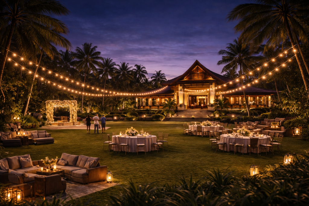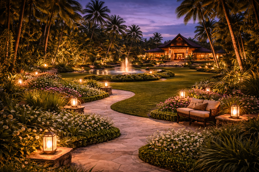 Framed by lush greenery and subtle lighting, these lawns create a versatile outdoor setting that adapts effortlessly from daytime leisure to